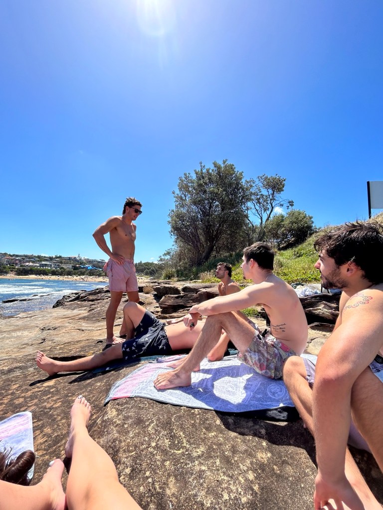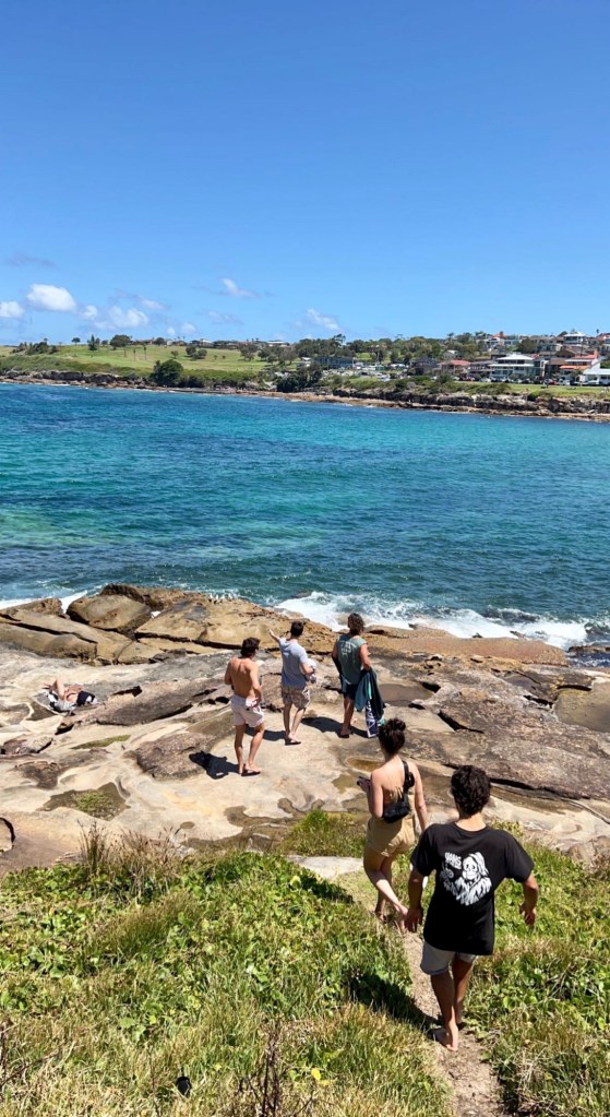 Yesterday, we spent the afternoon at Malabar beach. Malabar beach is a ten minute walk from Jesse and Callan’s unit with a smaller crowd and beautiful view. The boys took us to a more secluded area on the rocks that overlooks the beachside town. Before going for a swim, I thought it was a genius idea to take off my sunglasses, or ‘sunnies’, right on the rock. Sure enough, the water had swept them away within minutes. I was ridiculed by the boys for not knowing one of the main rules of being at the beach: always leave your things where you can see them. Nonetheless, I will take this as an excuse, and an opportunity, to find some new groovy sunnies to carry with me for the rest of our trip.